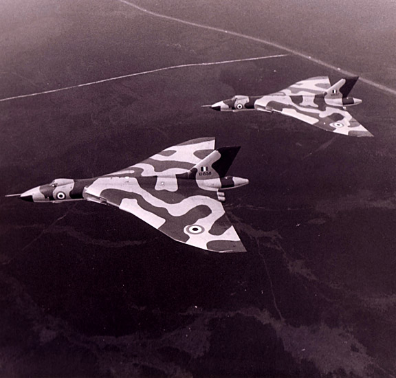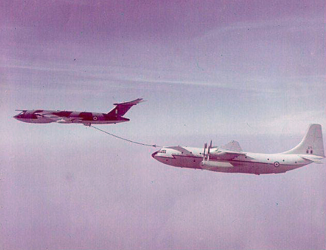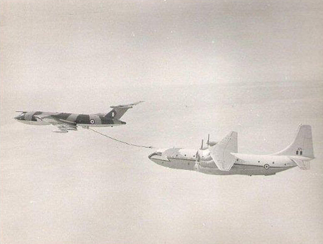 A Victor refueling a Belfast [Keith Bichard] A Victor refueling a Belfast [Keith Bichard] A rare photo of the 3 Vs. I believe there was no photo opportunity other than this one on 14 Sept 57 which I proposed when we were about to launch out of Boscombe Down  for Battle of Britain flypasts of significant bases. I had OC flying, Gp Capt Goodman, in the right seat of the Vulcan. The camera was with the rear seater in a Meteor 7. We were airborne for 4hrs 40. [Milt Cottee] XM651 at Barksdale AFB on 1/2 May 1971 after display for their 'At Home' day. Crew (unrecognizable!) L to R :- C/T Martyn (ASC), F/O Roy Bulley (AEO), F/L John Turner (Nav/plot), S/L 'Andy' Capp (Nav/rad), F/L Bob Peele (Co), F/L Bill MacGillivray (Capt.) [William MacGillivray] Ground crew. RAF Akrotiri. May 1971